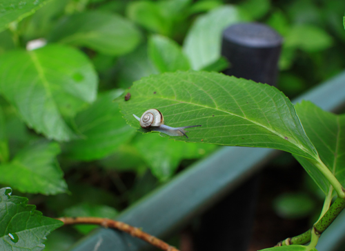 雨上がりだったので、葉っぱの上をかたつむりが散歩してました。